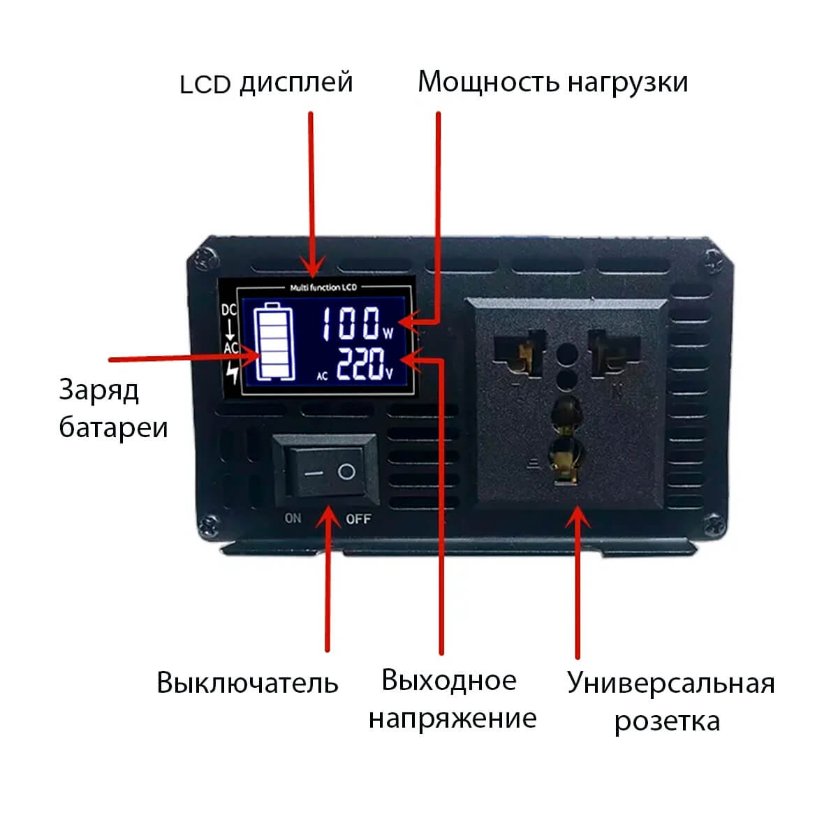 Передняя часть оснащена дисплеем с датчиком заряда, напряжения. Также есть розетка универсального разъема, которая подходит для вилок разного вида.